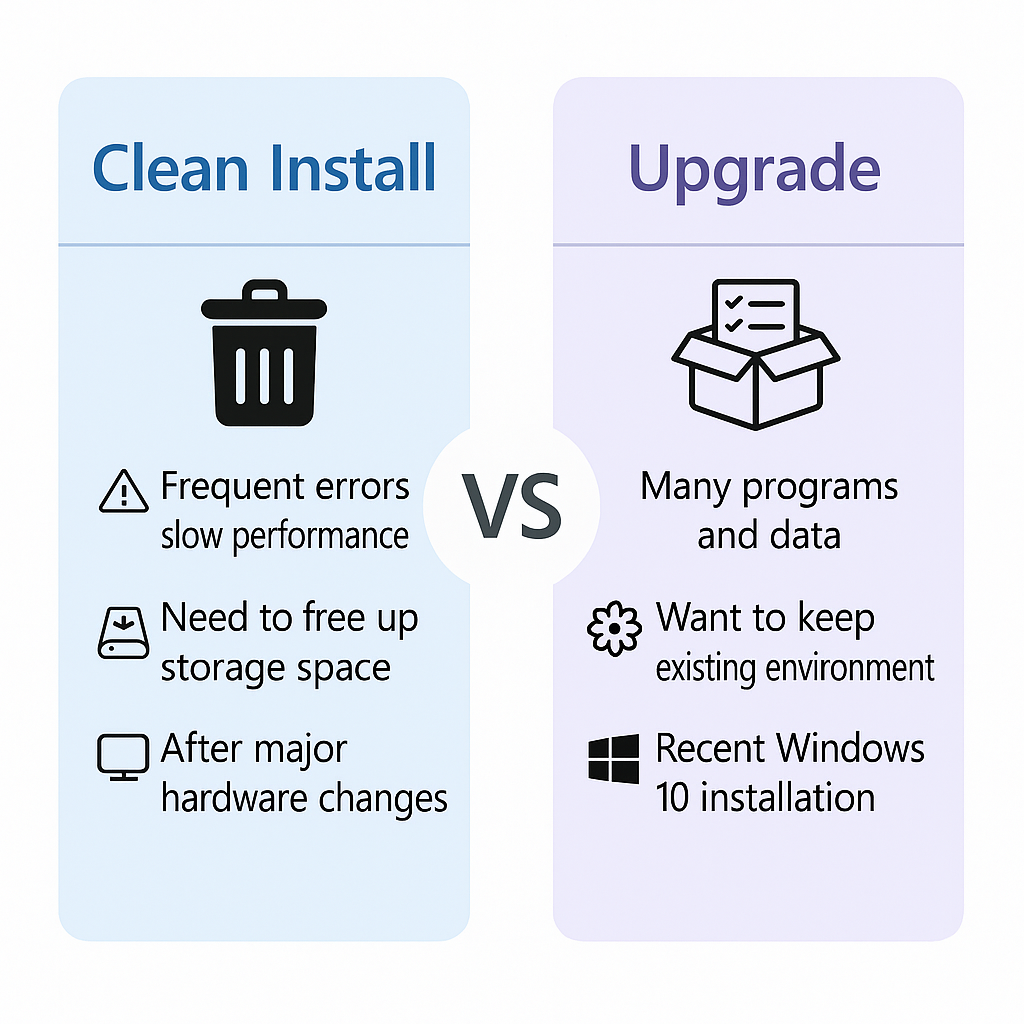 클린 설치 : 윈도우 사용 중 오류가 잦거나 속도가 느릴 때, 저장공간 정리가 필요할 때, 또는 메인보드나 SSD 교체 등 대규모 하드웨어 변경 이후에 추천됩니다. 반면, 업그레이드 : 프로그램과 데이터가 많아 재설치가 부담될 때, 이전 환경을 그대로 유지하면서 윈도우 11 기능을 이용하고자 할 때, 그리고 비교적 최근에 설치한 윈도우 10에서 윈도우 11로 이동할 때 적합합니다.