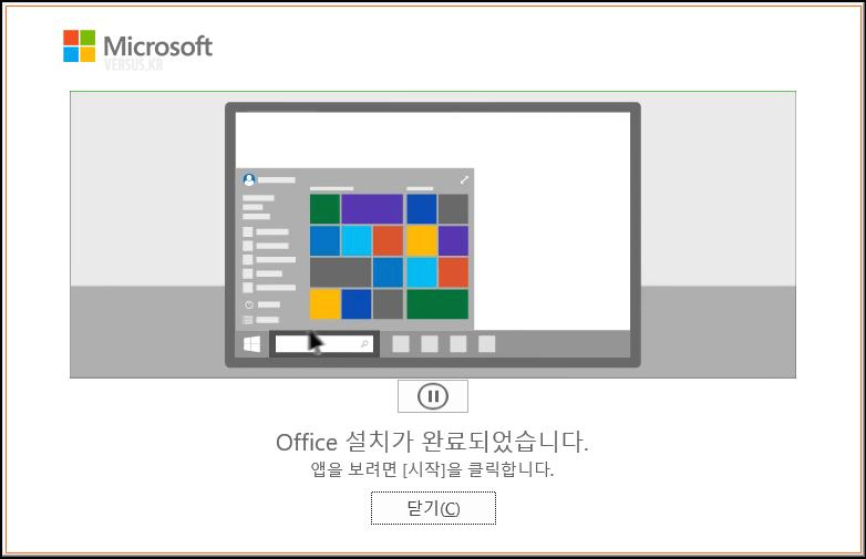 - Office 설치가 완료되었습니다. - 앱을 보려면 [시작]을 클릭합니다. - [닫기 (C)] <Click>